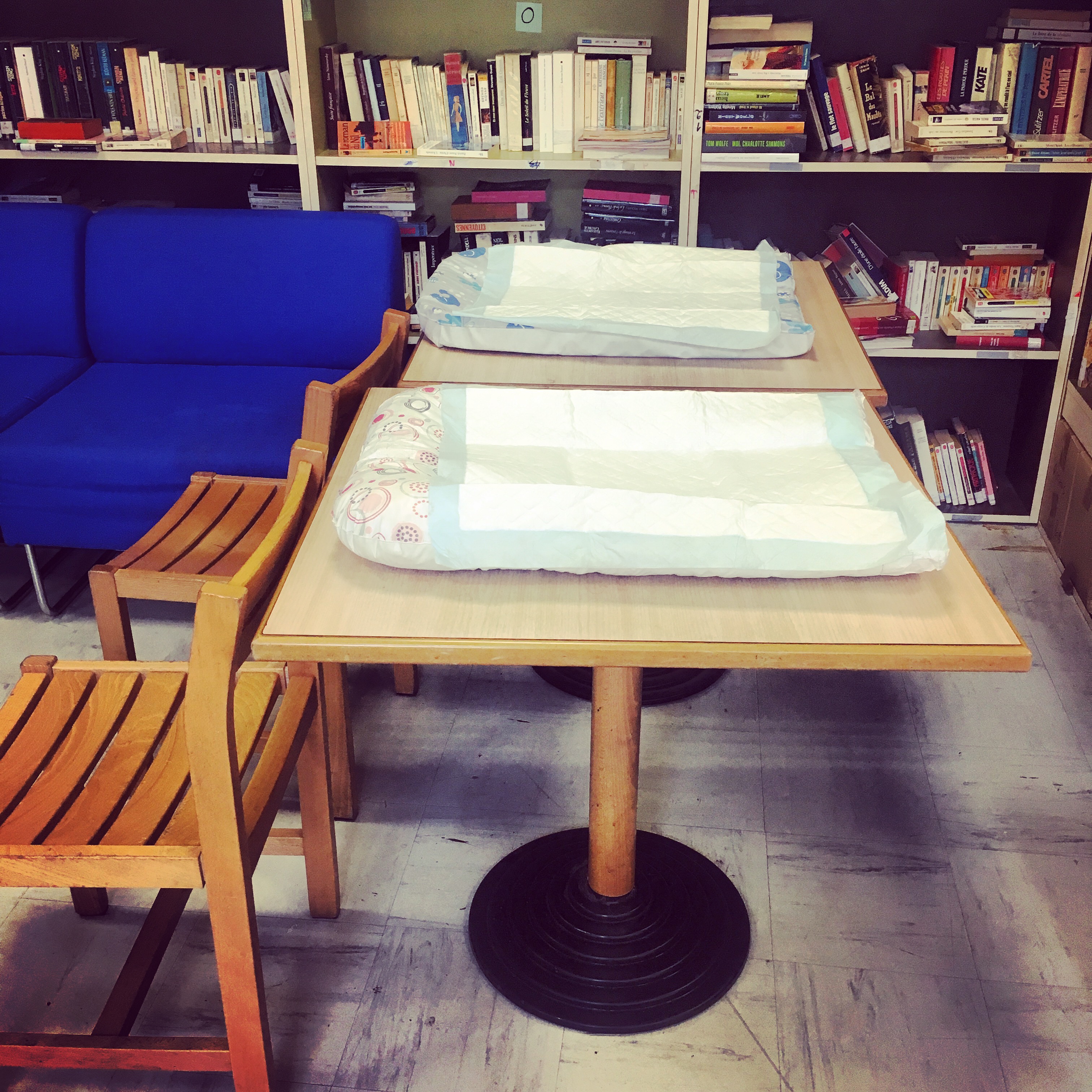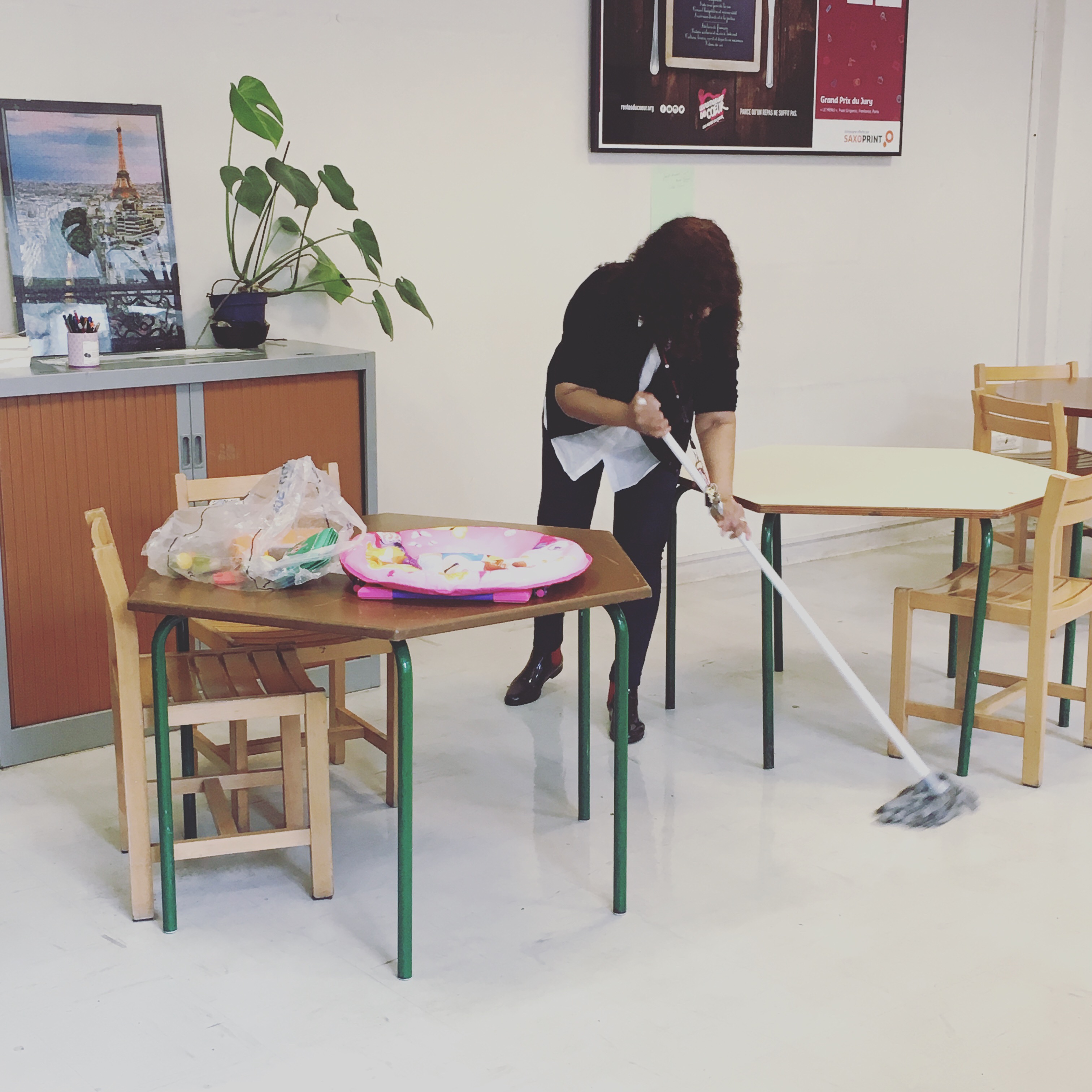 Alors qu’elle nettoie, range, indique aux autres bénévoles quoi faire, distribue les tâches « Ah bah, Hedia, tiens, il faudra désinfecter les tables aussi. Et Sabine, s’il te plaît, tu peux trier les boîtes de lait ?», Lucienne s’inquiète, elle n’a pas même pas encore trouvé le temps de manger ! Qu’à cela ne tienne, Sabine, son bras droit, et elle, peuvent filer. Je reste là, avec les autres, pour aider. Ma mission ? « Tu mets les chaises ici, bbbbien alignées hein ? Et tu peux installer le tapis de jeu avec quelques coussins aussi. Merci ! » m’indique Lucienne avant de s’échapper acheter son repas de midi.